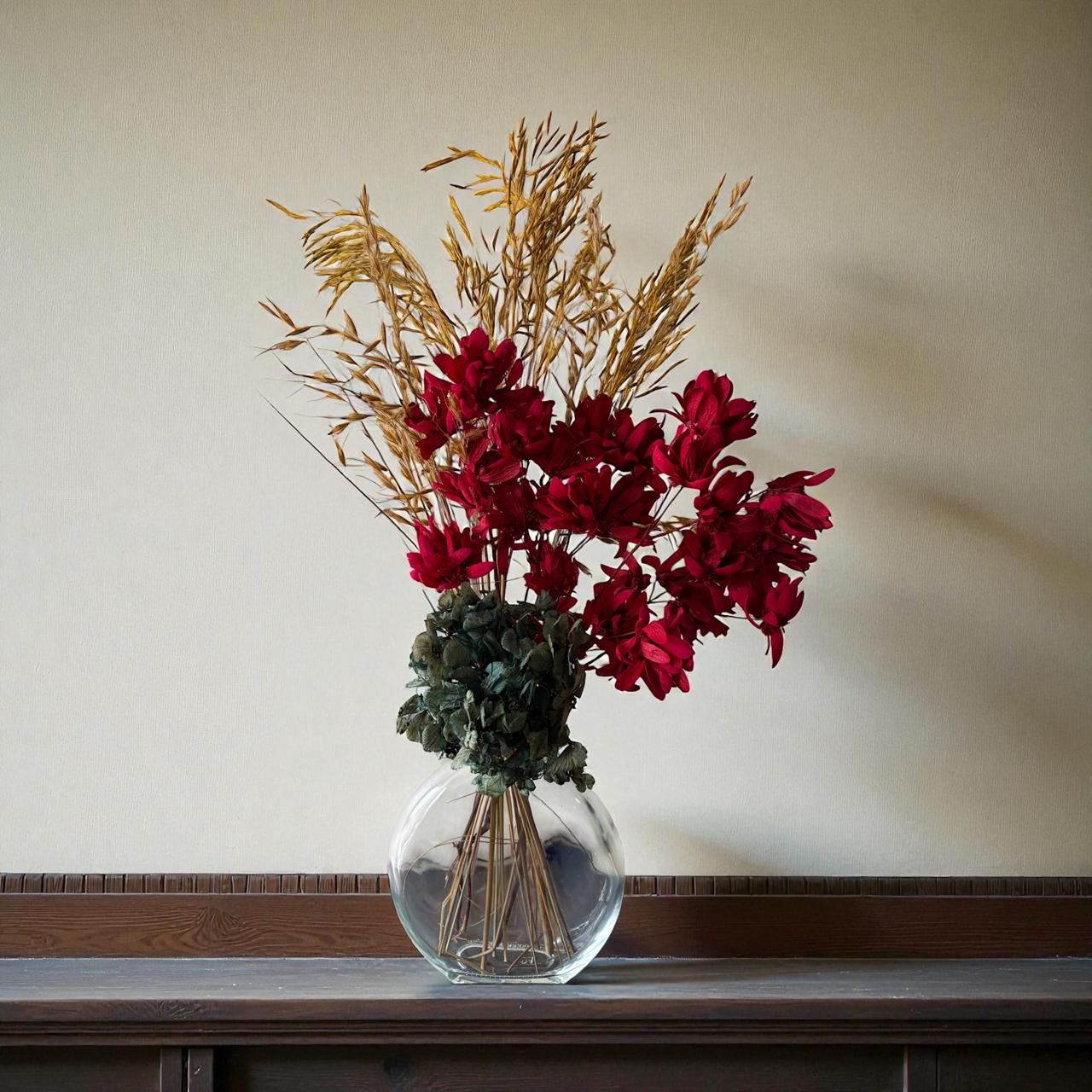 Arranjo: Congeias vermelhas, hortensia e capim dourado