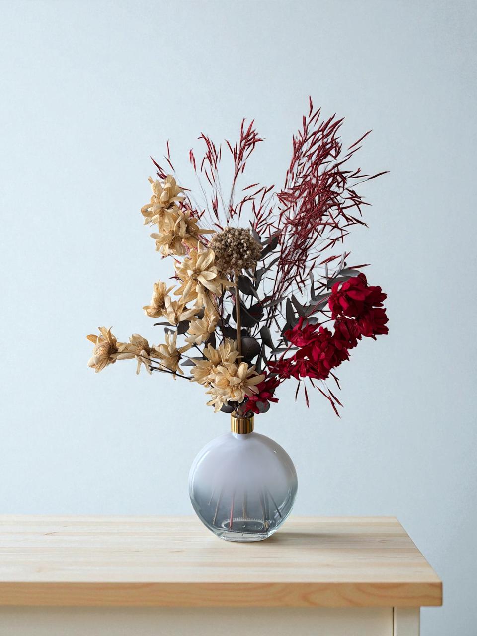 Arranjo: Congeias vermelhas e brancas, eucalipto e flor de alho